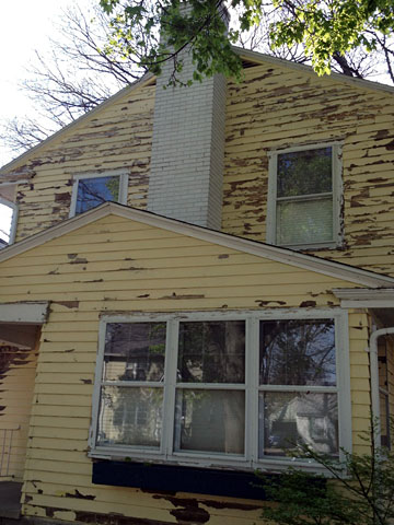 1920’s built East Lansing home exterior painting project before more than 50 hours of scraping prepares the house for painting by Full Color Painting LLC